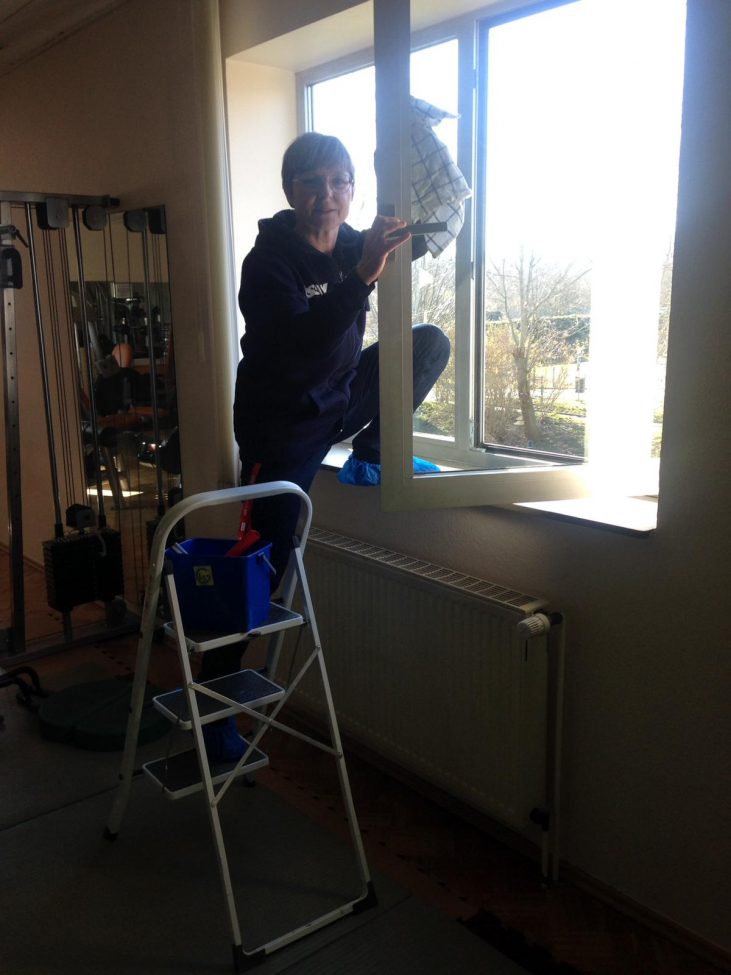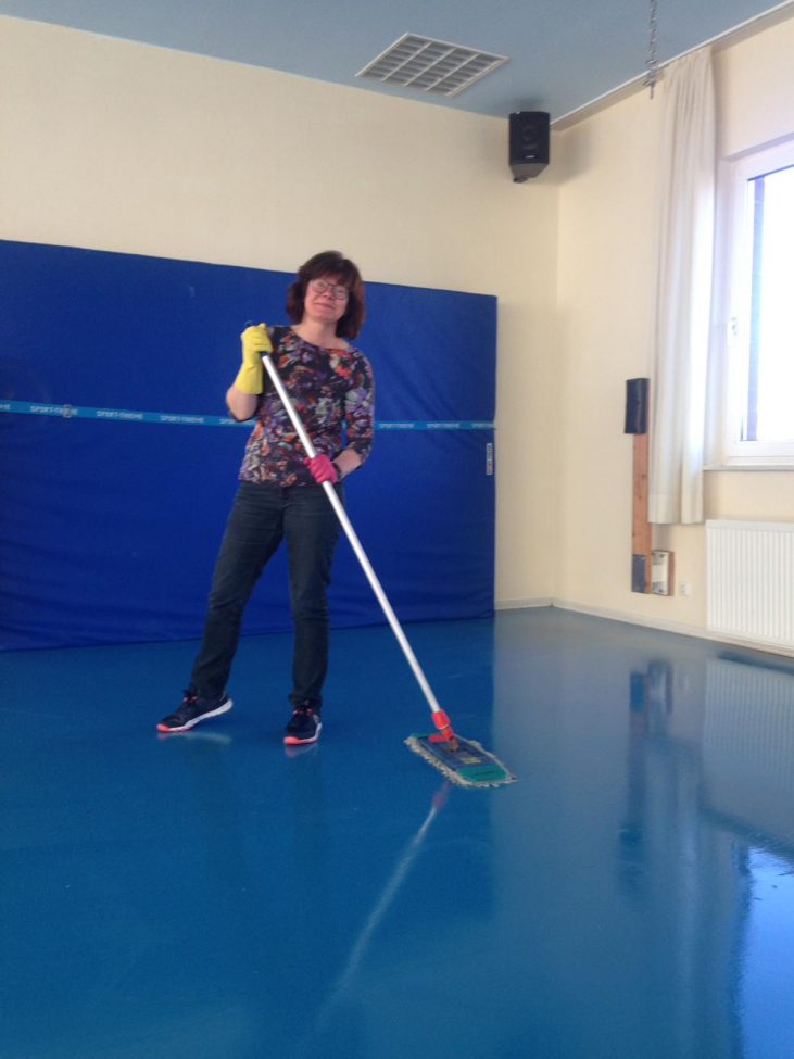 …. und halten uns u.a. mit Putzen fit, damit wir bald wieder zusammen in unseren blitzeblanken Rümlichkeiten starten können.