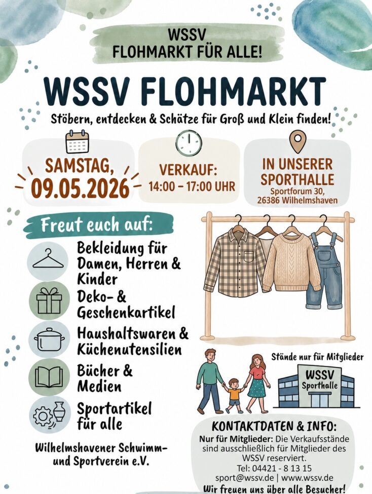 WSSV – Flohmarkt (09.05.2026) Apr. 28, 2026 | Allgemein (Newsticker), WSSV WSSV – Flohmarkt Samstag, 09.05.2026 14:00 – 17:00 Uhr Stöbern, entdecken & Schätze für Groß und Klein finden Sporthalle WSSV Sportforum 30, 26386 Wilhelmshaven